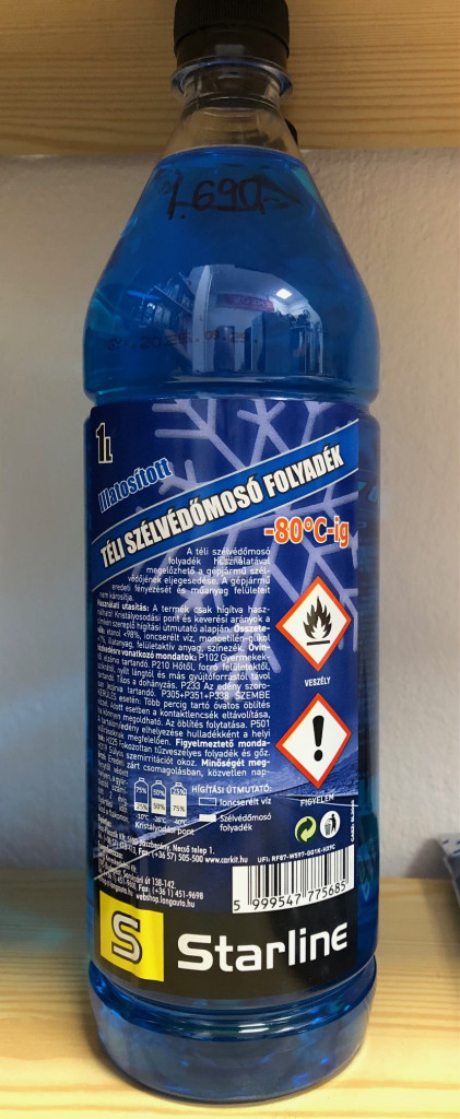 Téli használhatú tisztítóanyag autóablakmosó berendezéshez, –80 °C-ig fagyálló.